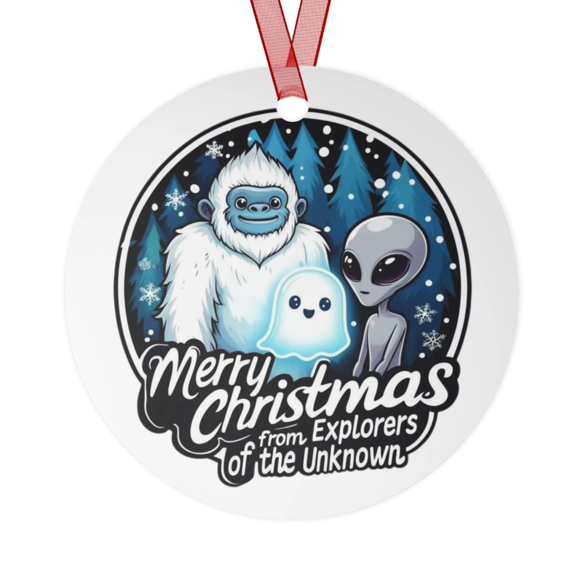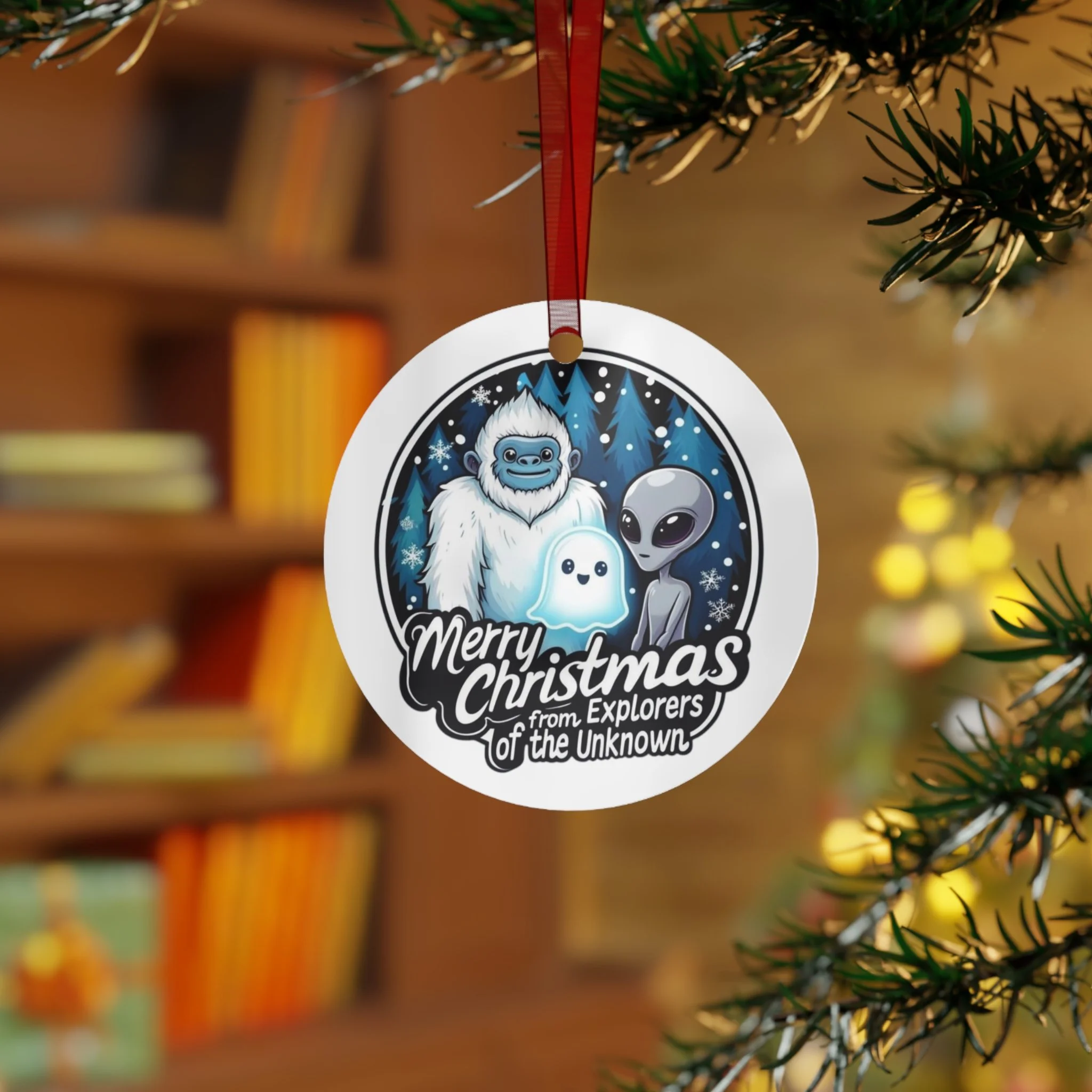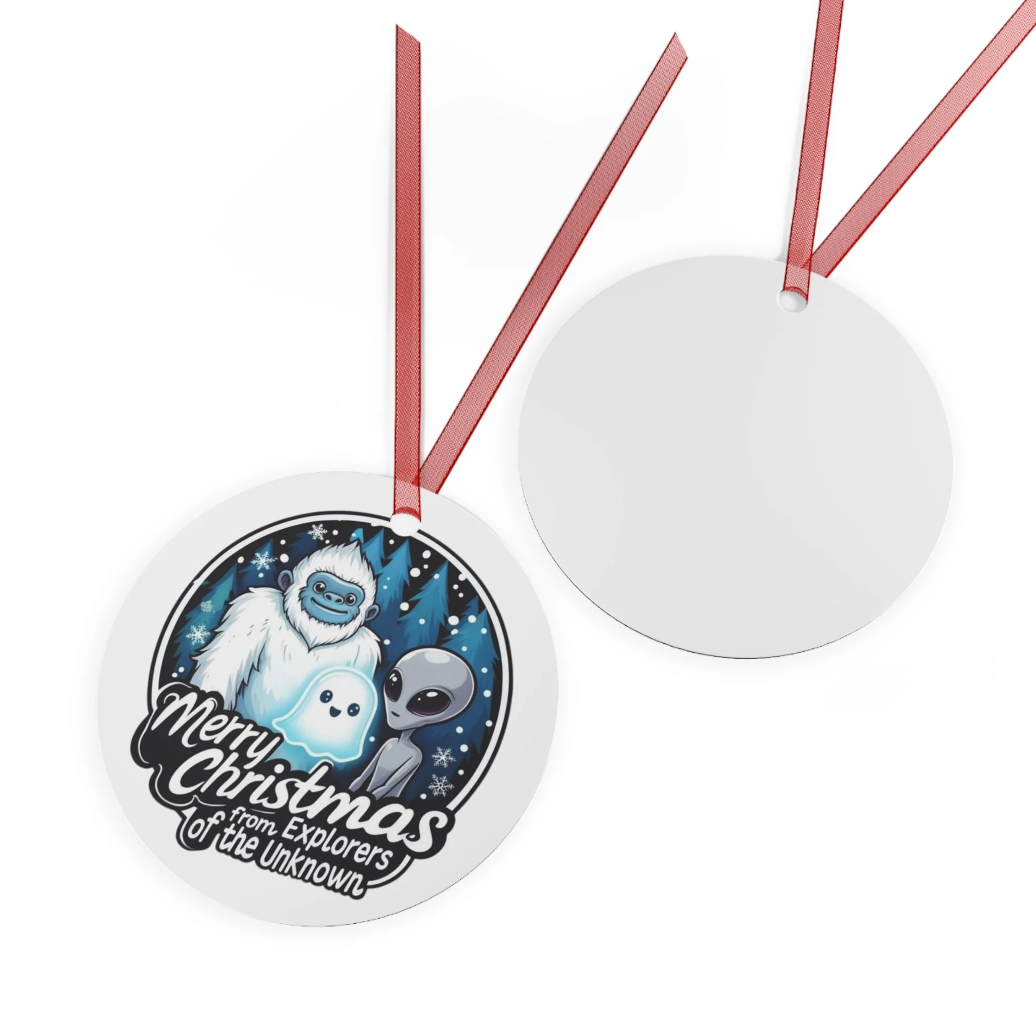 Christmas Alien & Yeti Metal Ornament — "Merry Christmas from Explorers of the Unknown"